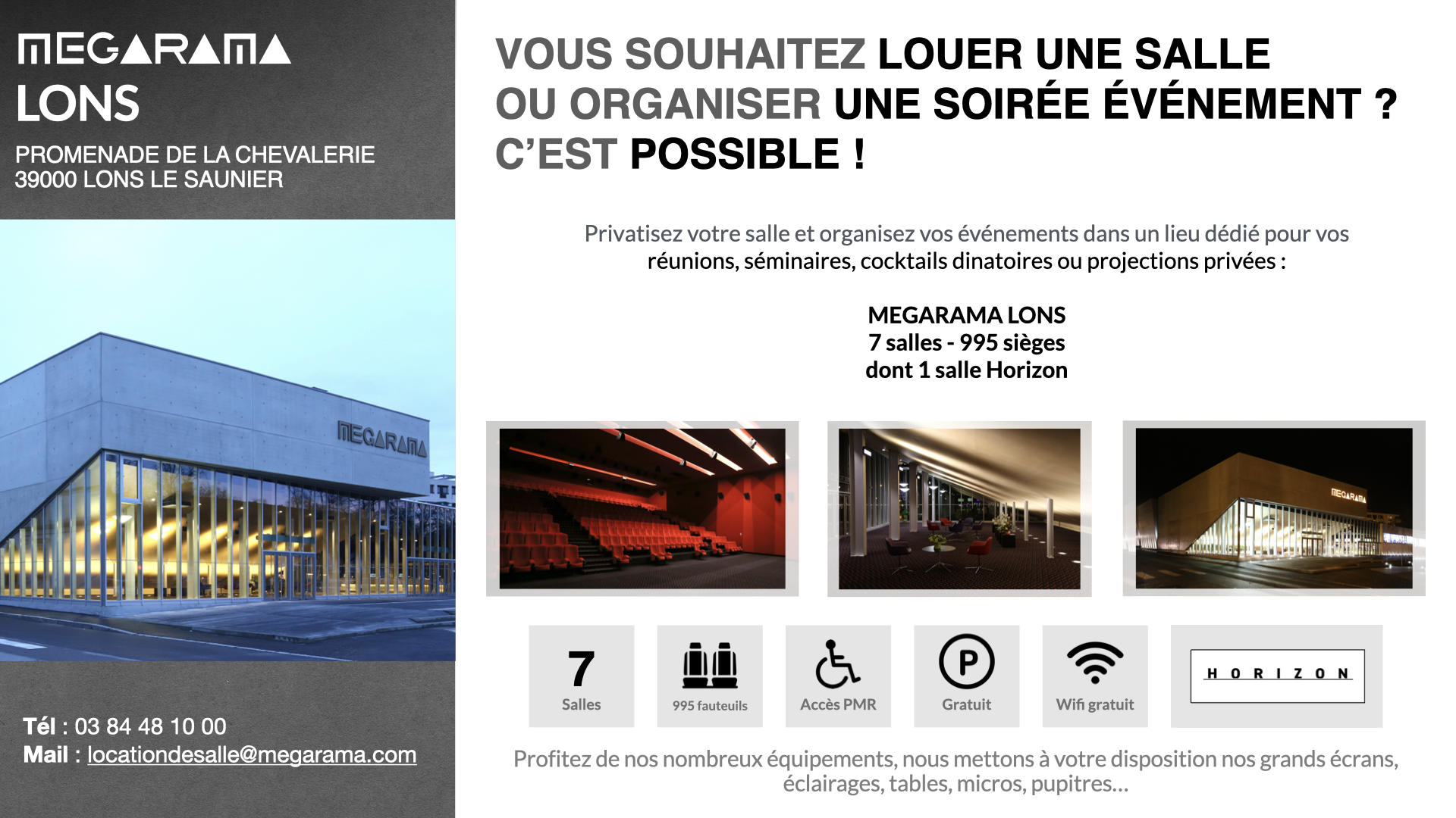 Pour toute demande de location de salle, nous vous invitons à nous contacter par e-mail à l'adresse locationdesalle@megarama.com en nous indiquant les informations suivantes :
